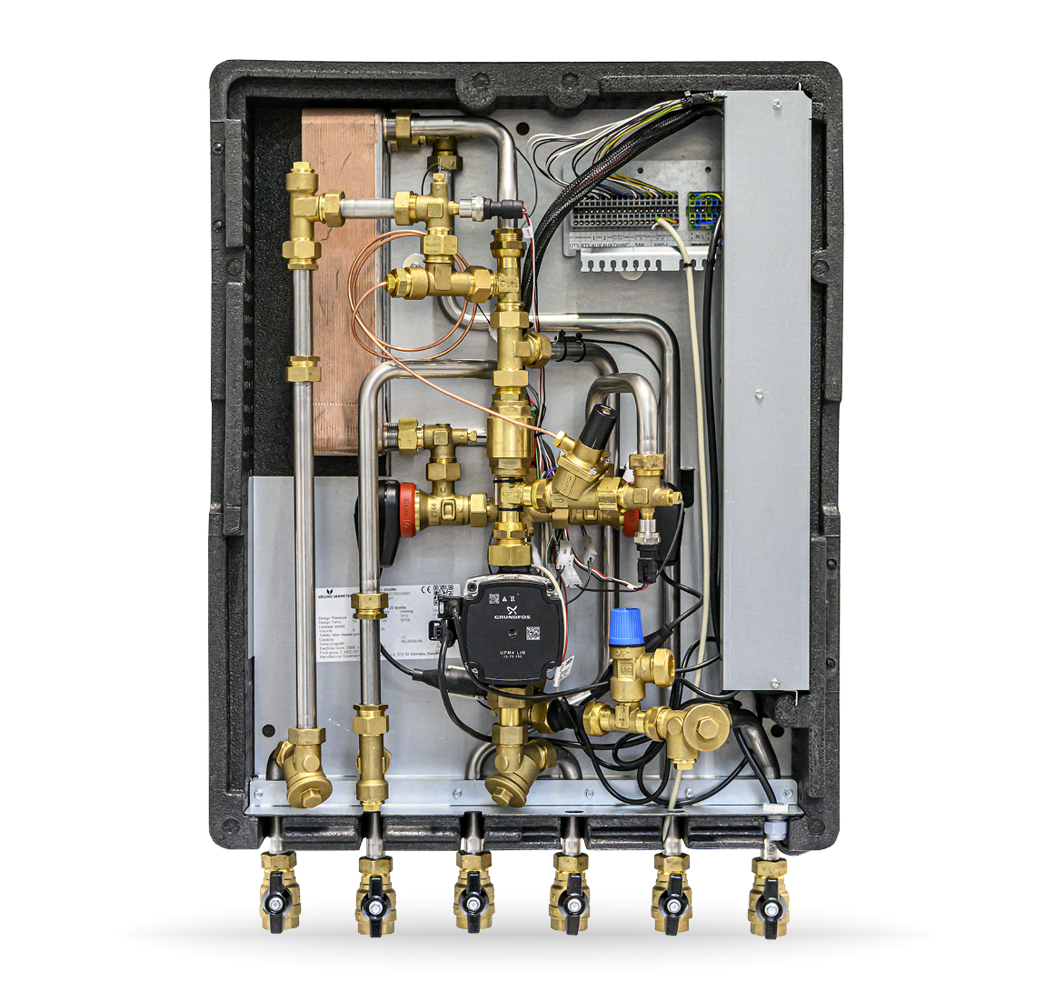 Den nye fjernvarmeunit leveres fabriksmonteret og trykprøvet, så installationen kan udføres hurtigt og ensartet. Logisk komponentplacering og god adgang reducerer spildtid både ved montering og service.
